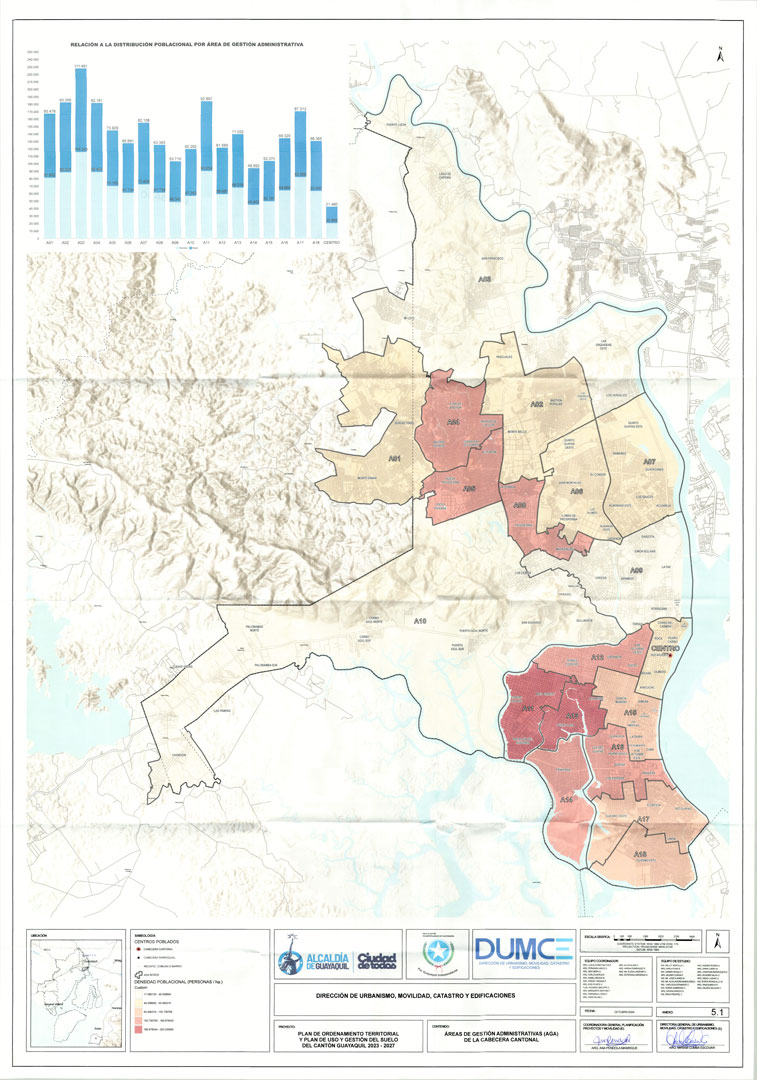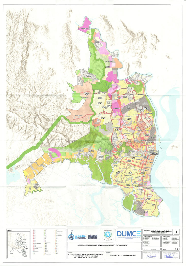En esta actualización 2023-2027 del PDOT y PUGS, correspondiente al período de gestión del Alcalde Aquiles Alvarez, se introdujo un cambio de paradigma en la planificación del territorio. Si bien el cantón Guayaquil conserva su división en parroquias urbanas (15) y rurales (5), en su cabecera cantonal (donde reside más del 85% de la población del cantón) la administración de Aquiles Álvarez implementó, a través de una Ordenanza aprobada por el M. I. Concejo Cantonal al inicio de su gestión, una división de la cabecera cantonal en diecinueve (19) Áreas de Gestión Administrativa, a fin de “distribuir de manera adecuada, equitativa y eficaz los programas, obras y proyectos municipales, y procurar la satisfacción de las necesidades básicas insatisfechas de la población, medida principalmente con los indicadores relacionados con el equipamiento urbano, dando prioridad a aquellas cuyos indicadores sean menores” (Artículo 1).