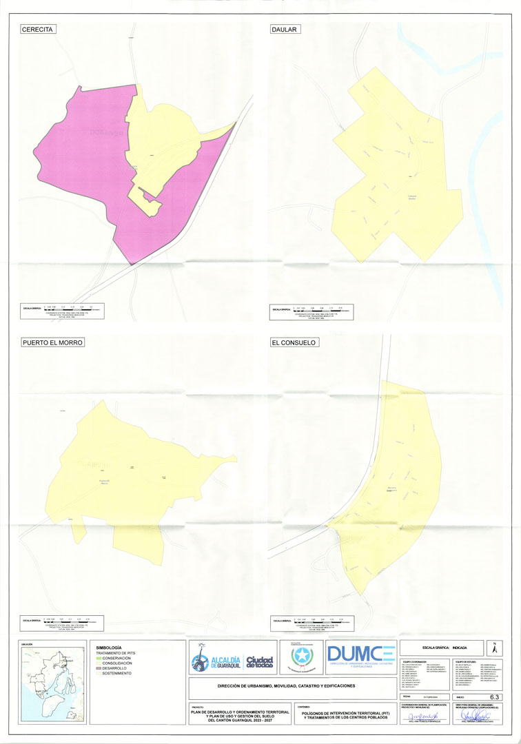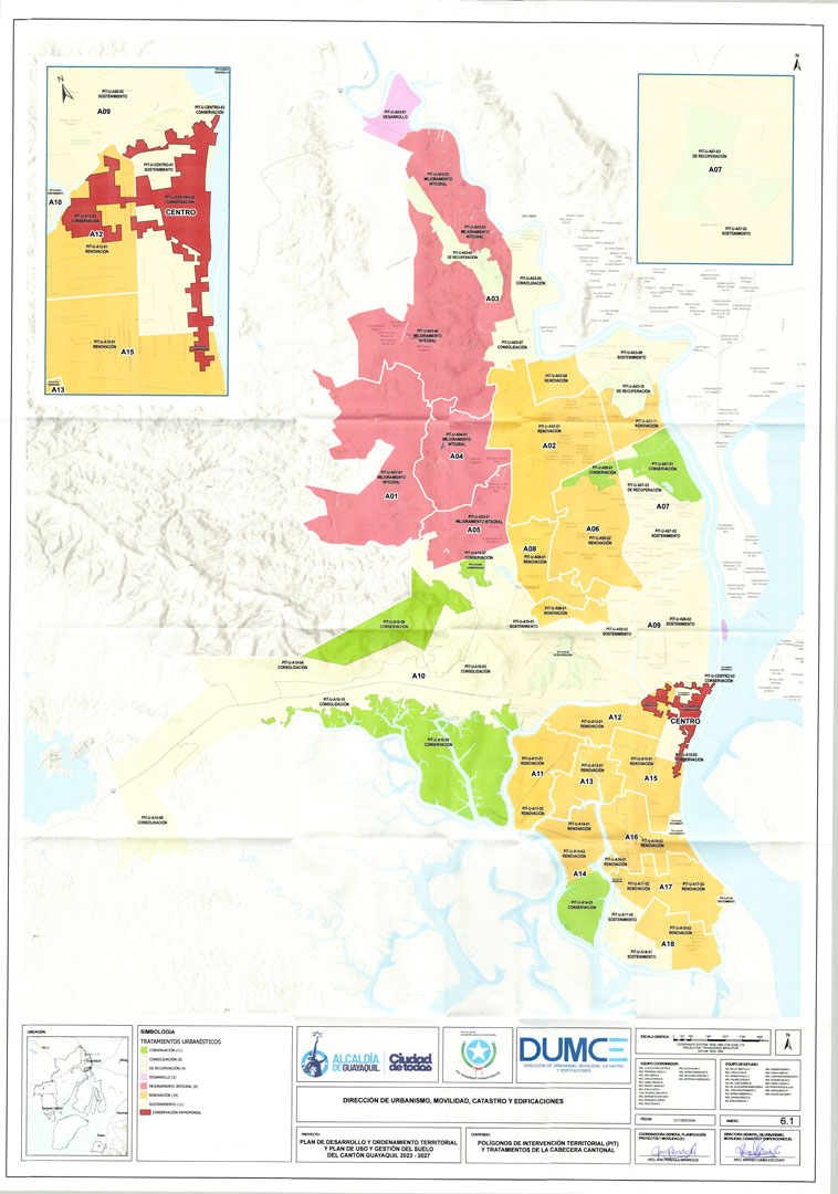 A partir de la clasificación del suelo del cantón en urbano y en rural, se asignaron los tratamientos urbanísticos correspondientes a cada polígono de intervención territorial.