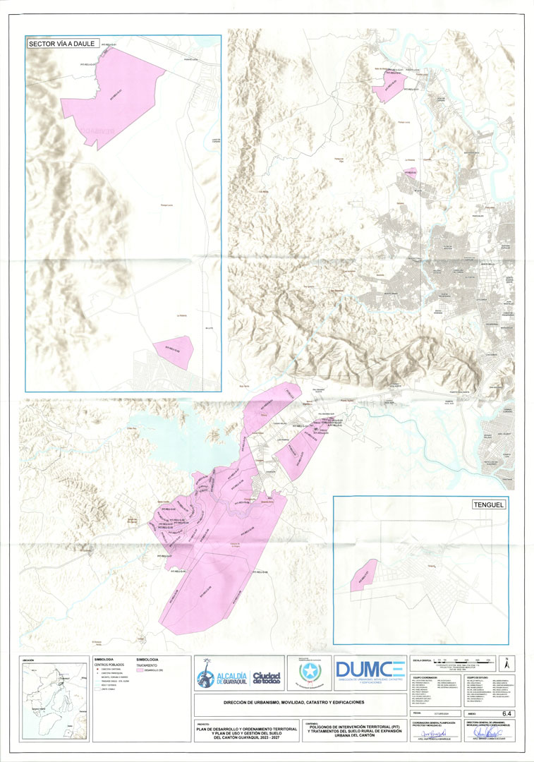 En la Ordenanza de actualización del PDOT y PUGS se reconoce a los siguientes polígonos de intervención territorial (PIT): cincuenta y nueve (59) PIT para la cabecera cantonal; once (11) PIT para el suelo rural de expansión urbana; doscientos nueve (209) PIT para el área rural; diecisiete (17) PIT para las cabeceras rurales parroquiales; cinco (5) PIT para los centros poblados.
