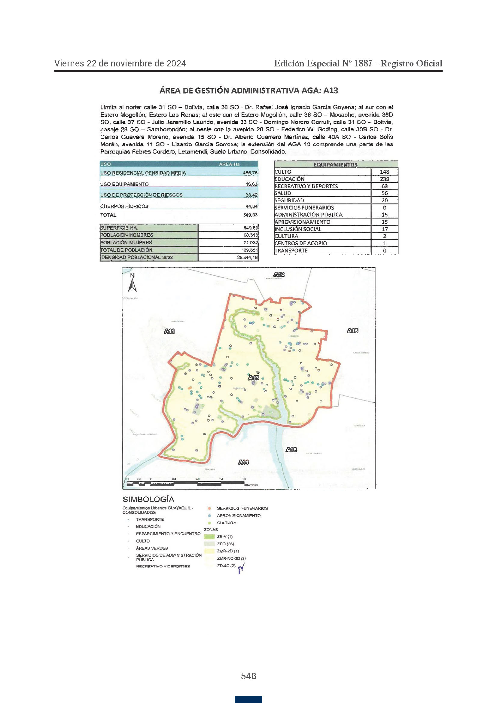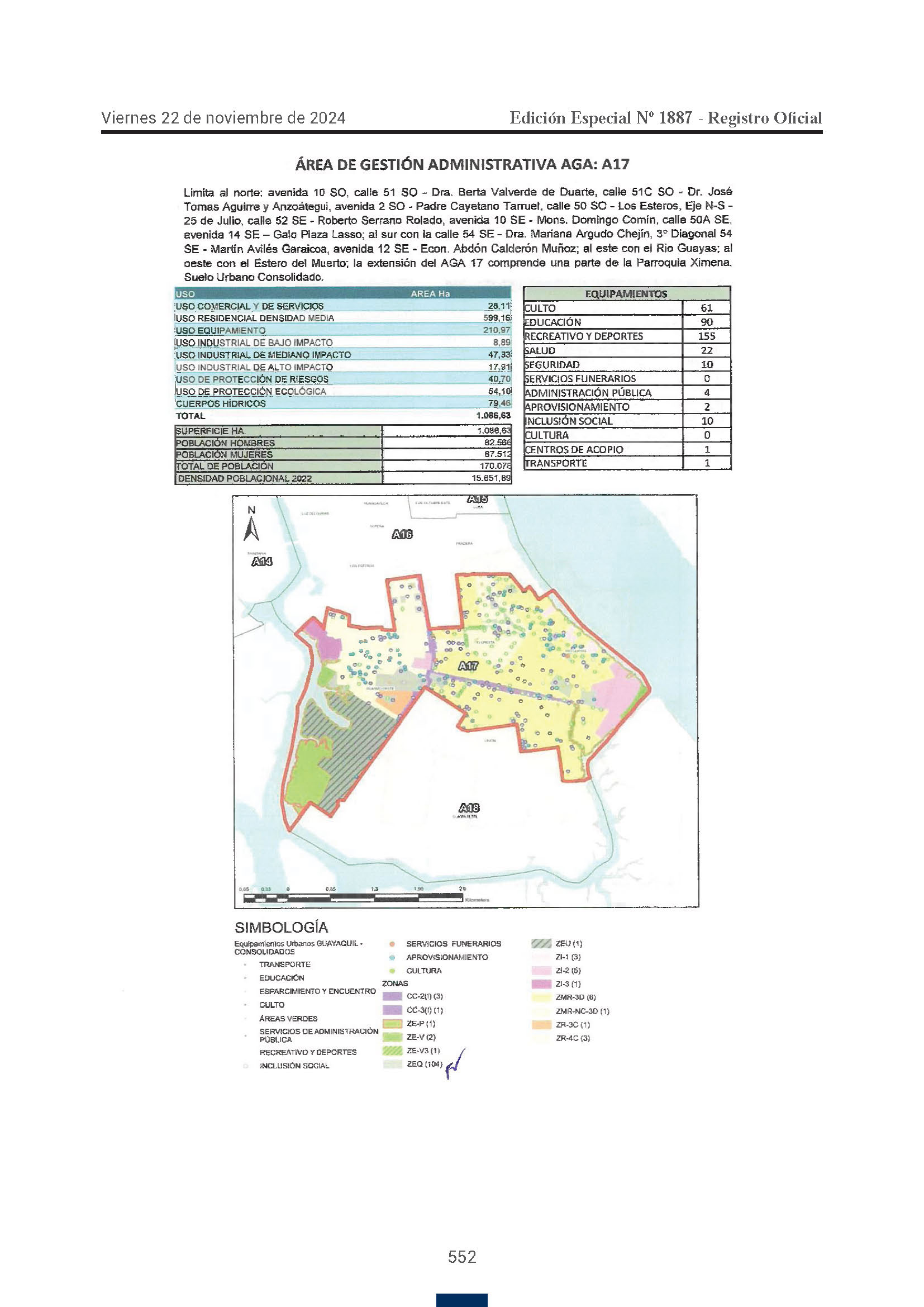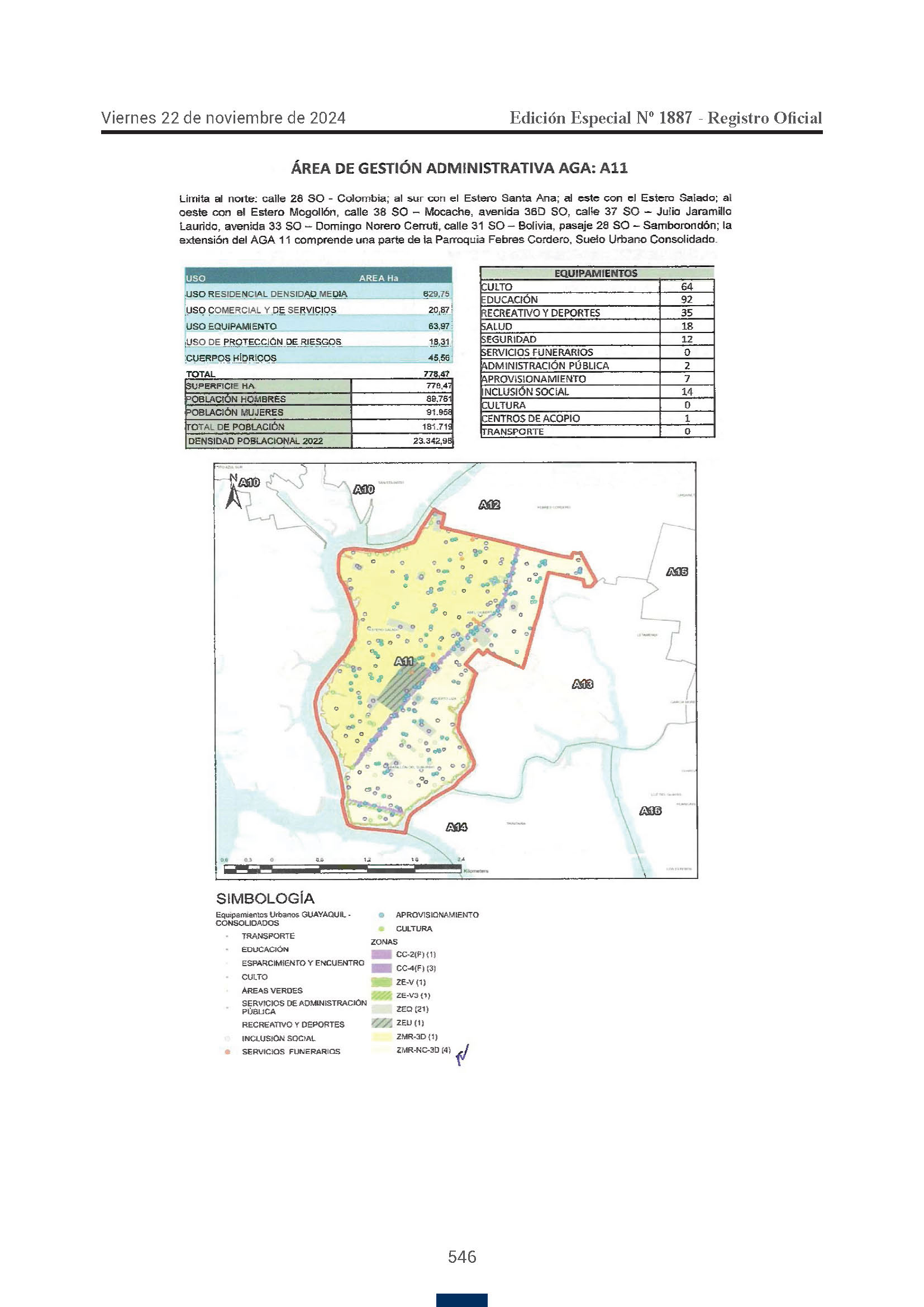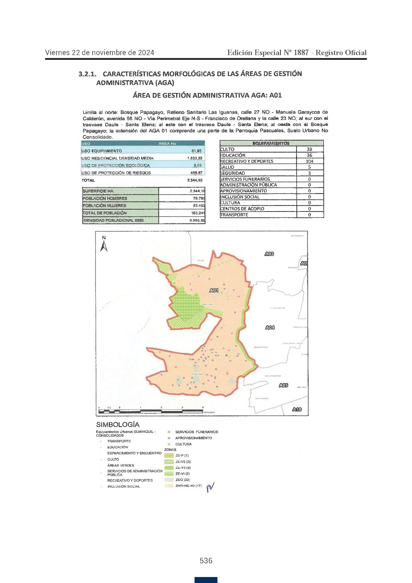 El suelo urbano de la cabecera cantonal se divide en diecinueve (19) Áreas de Gestión Administrativa (AGA). Esta división por AGA es de uso obligatorio por todas las entidades y órganos del Gobierno Autónomo Descentralizado Municipal de Guayaquil para distribuir los recursos de manera adecuada, equitativa y eficaz, a través de una planificación orientada a satisfacer las necesidades básicas insatisfechas de la población del cantón.