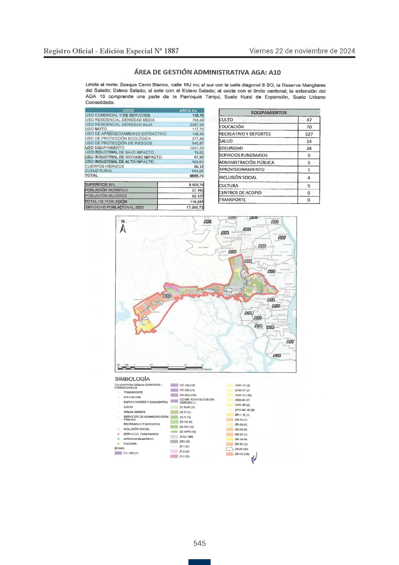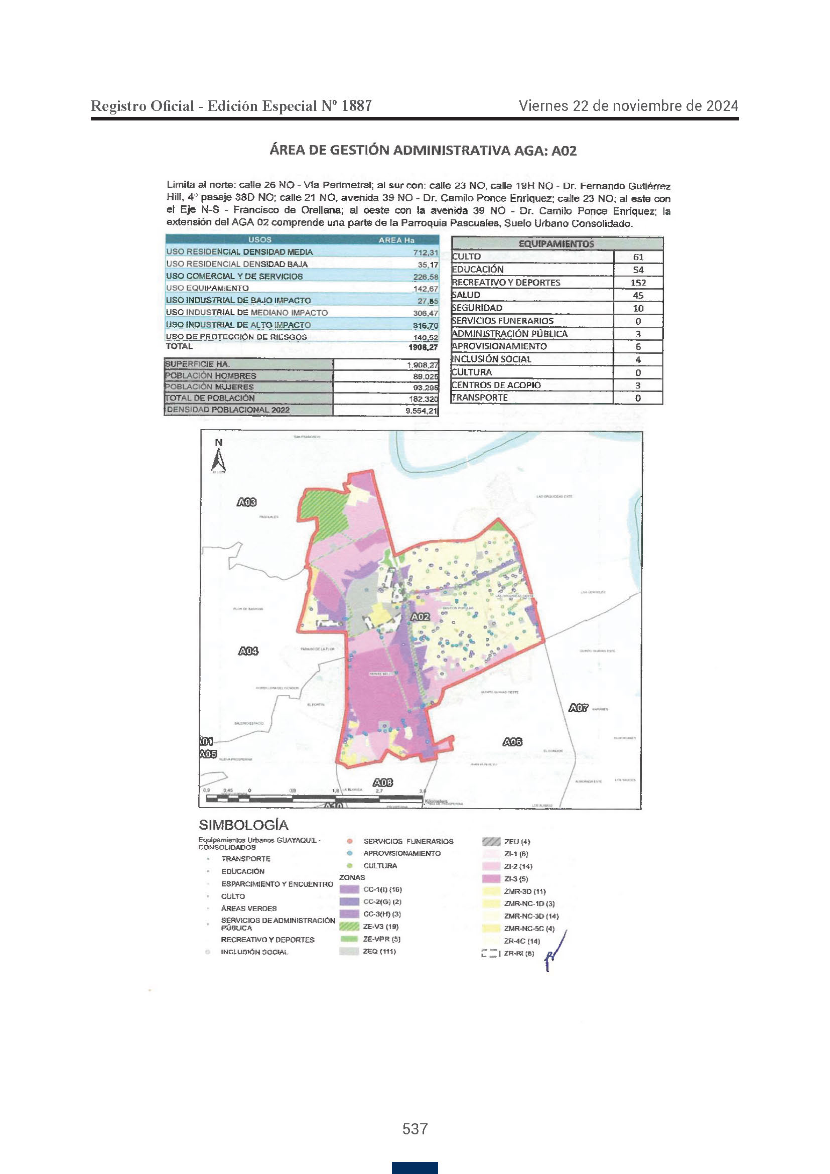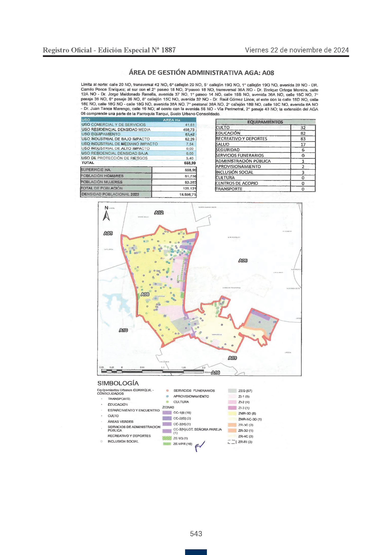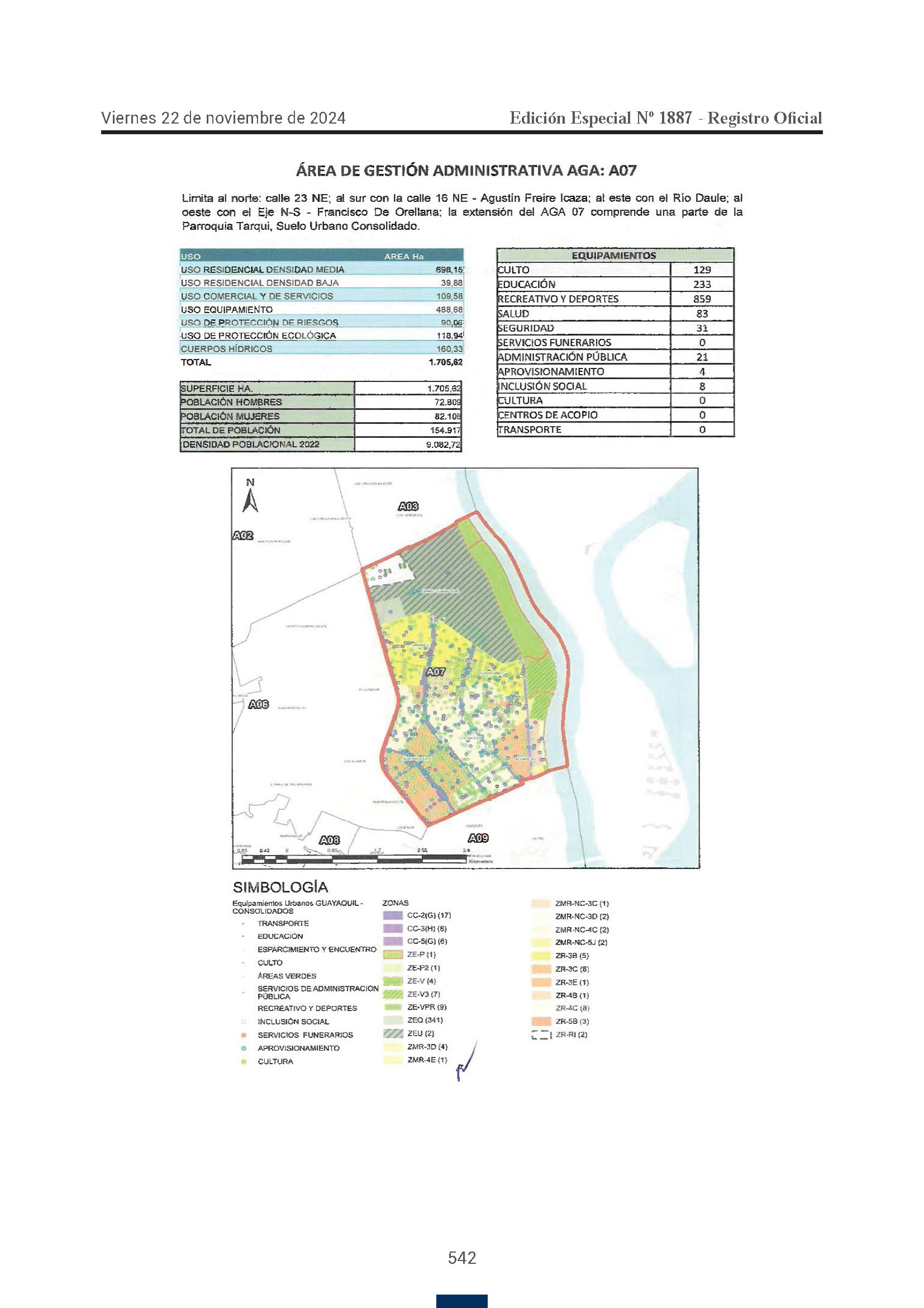 El suelo urbano de la cabecera cantonal se divide en diecinueve (19) Áreas de Gestión Administrativa (AGA). Esta división por AGA es de uso obligatorio por todas las entidades y órganos del Gobierno Autónomo Descentralizado Municipal de Guayaquil para distribuir los recursos de manera adecuada, equitativa y eficaz, a través de una planificación orientada a satisfacer las necesidades básicas insatisfechas de la población del cantón.